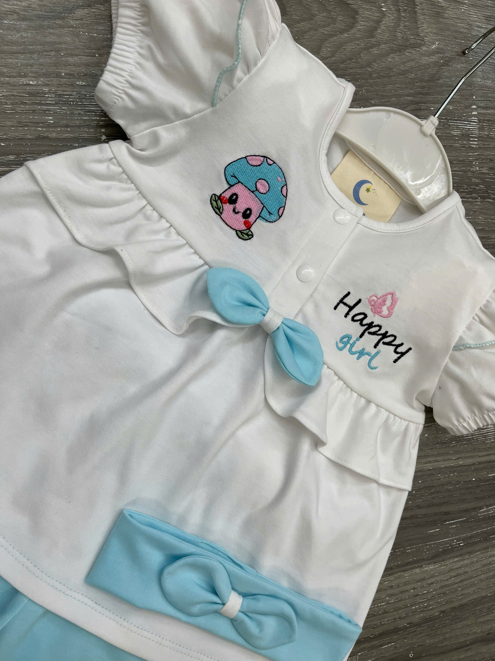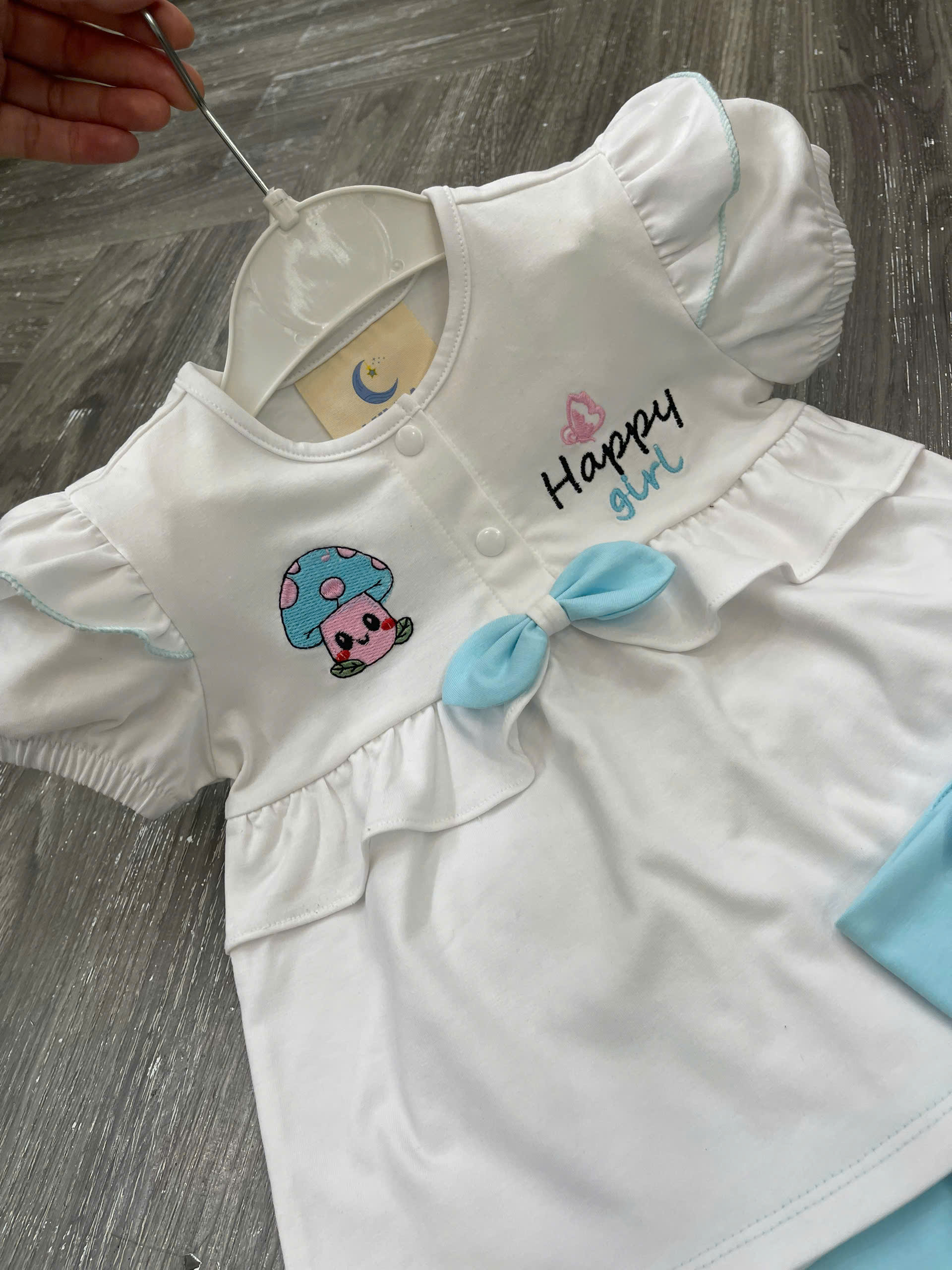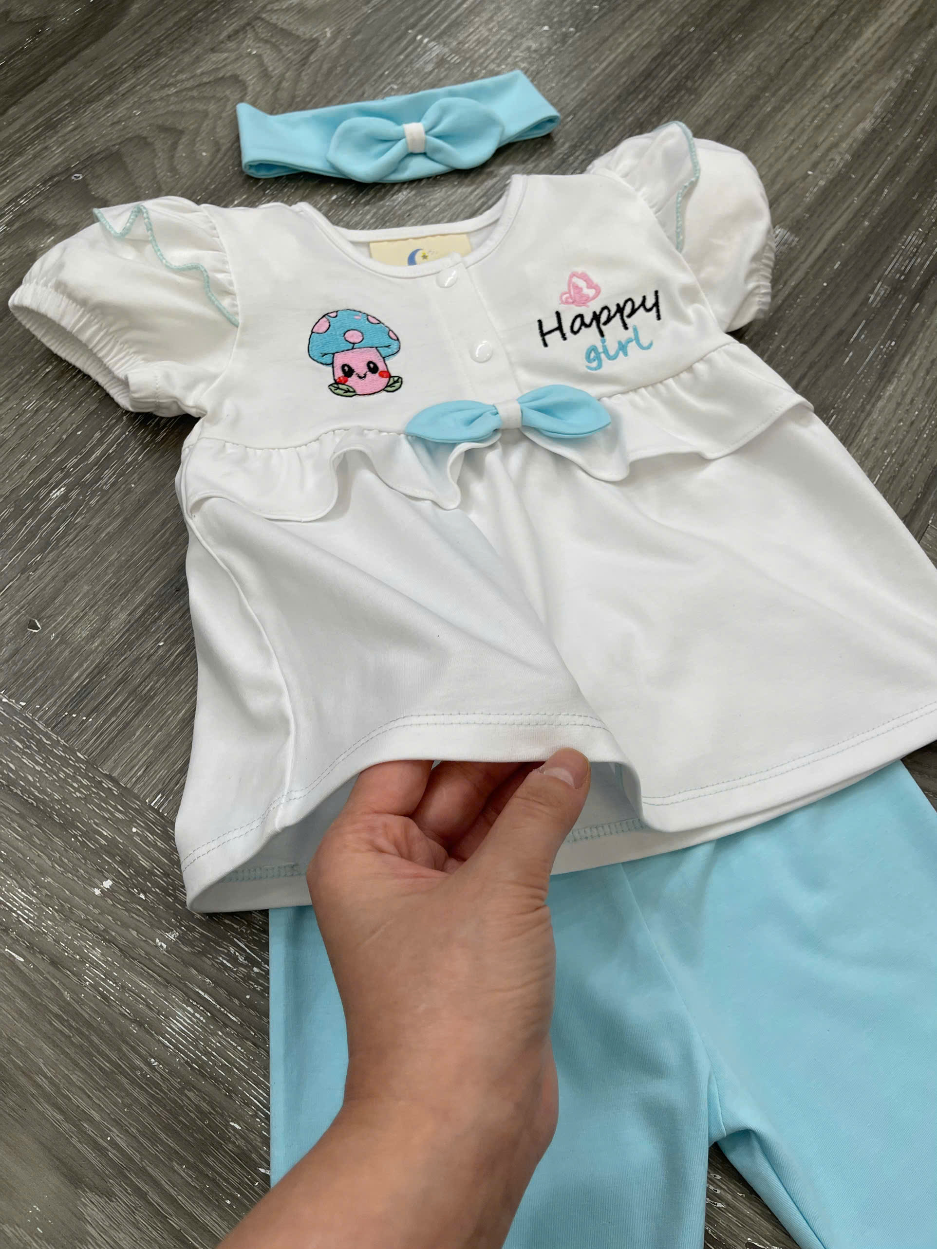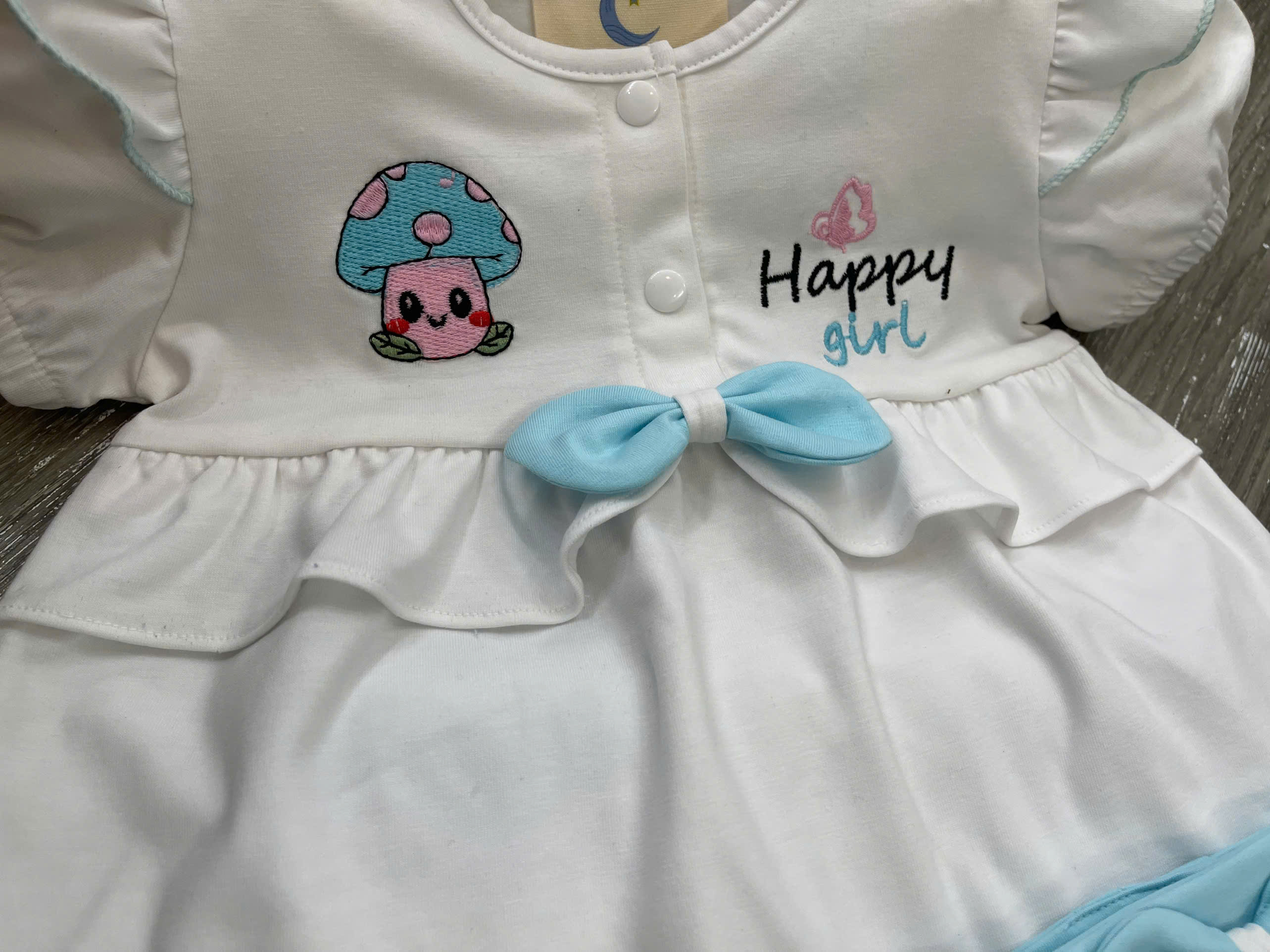 Họa tiết: Thêu hình nấm – chữ Happy Girl – nơ phối dễ thương