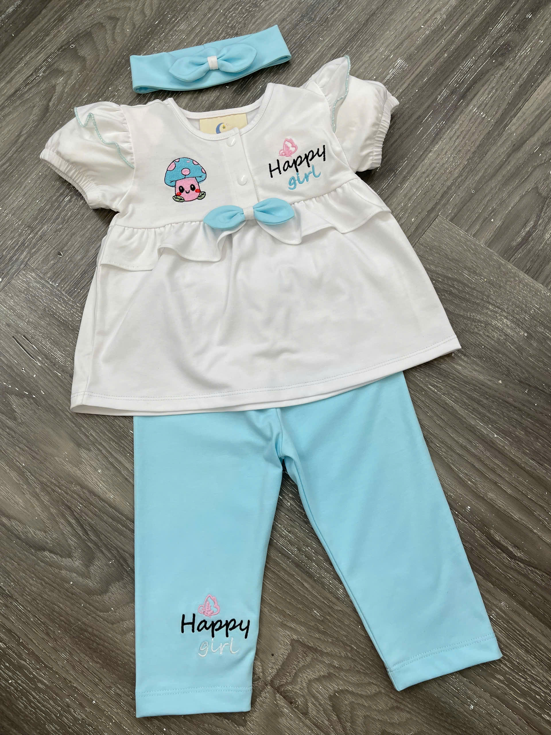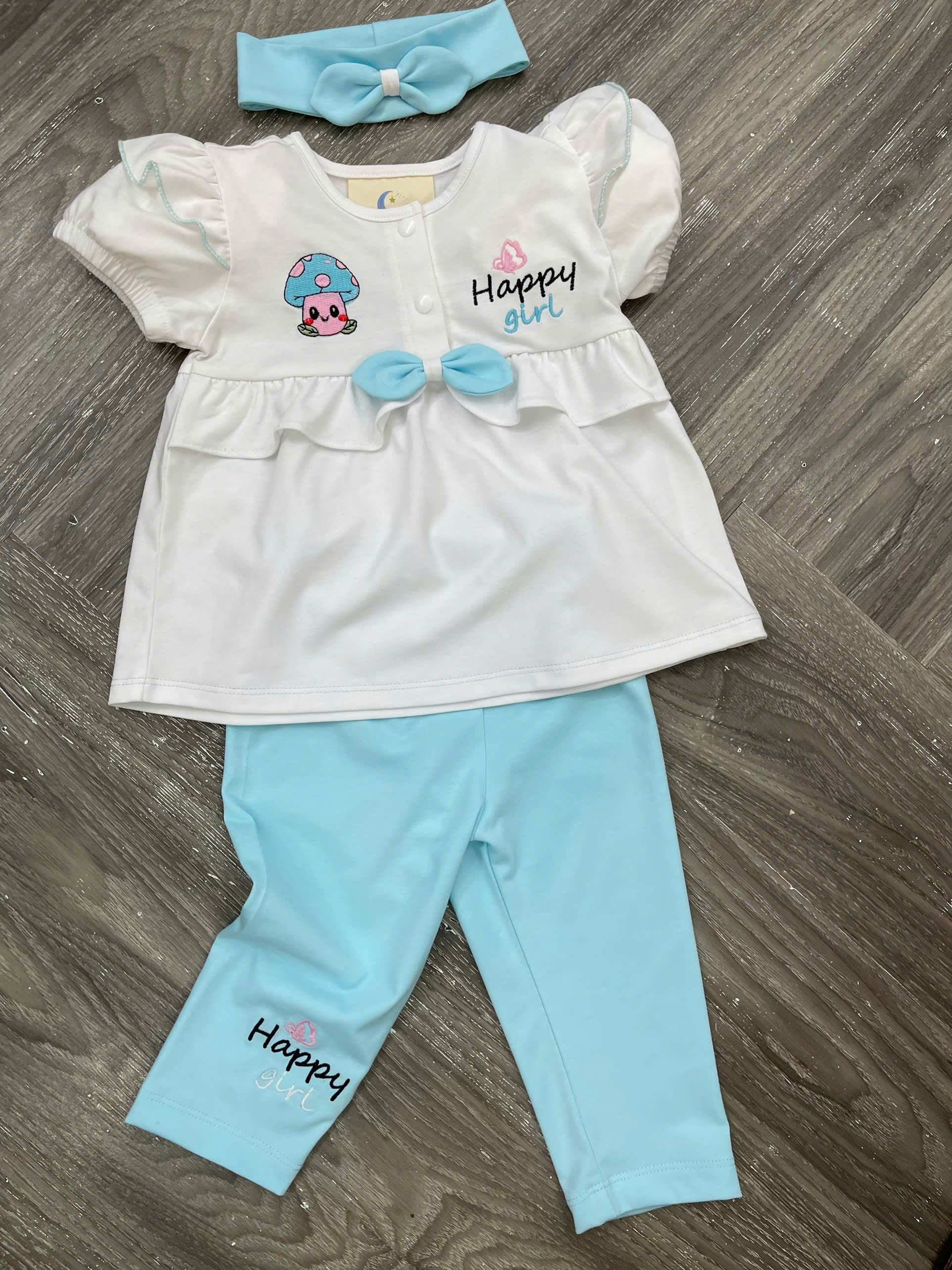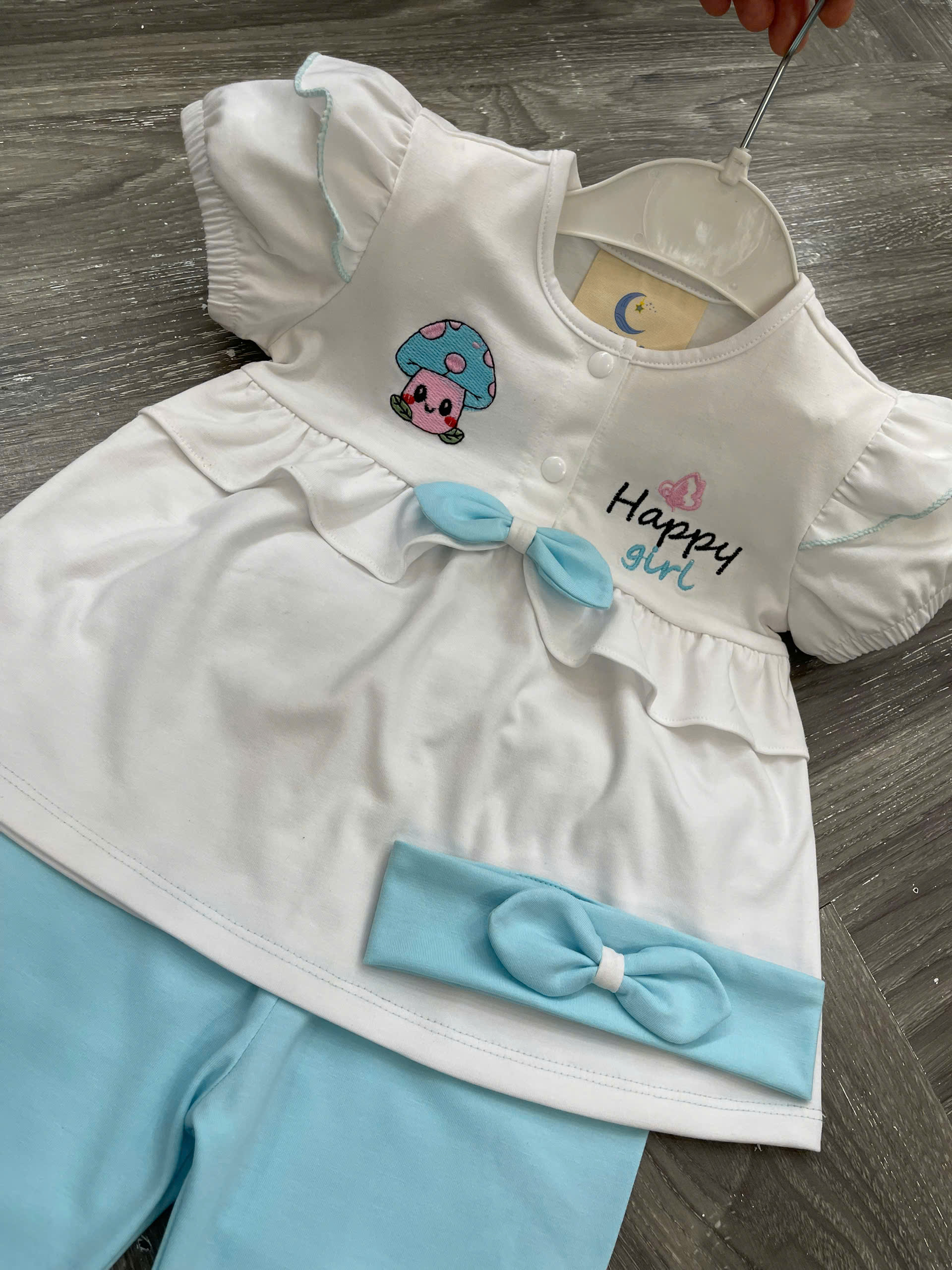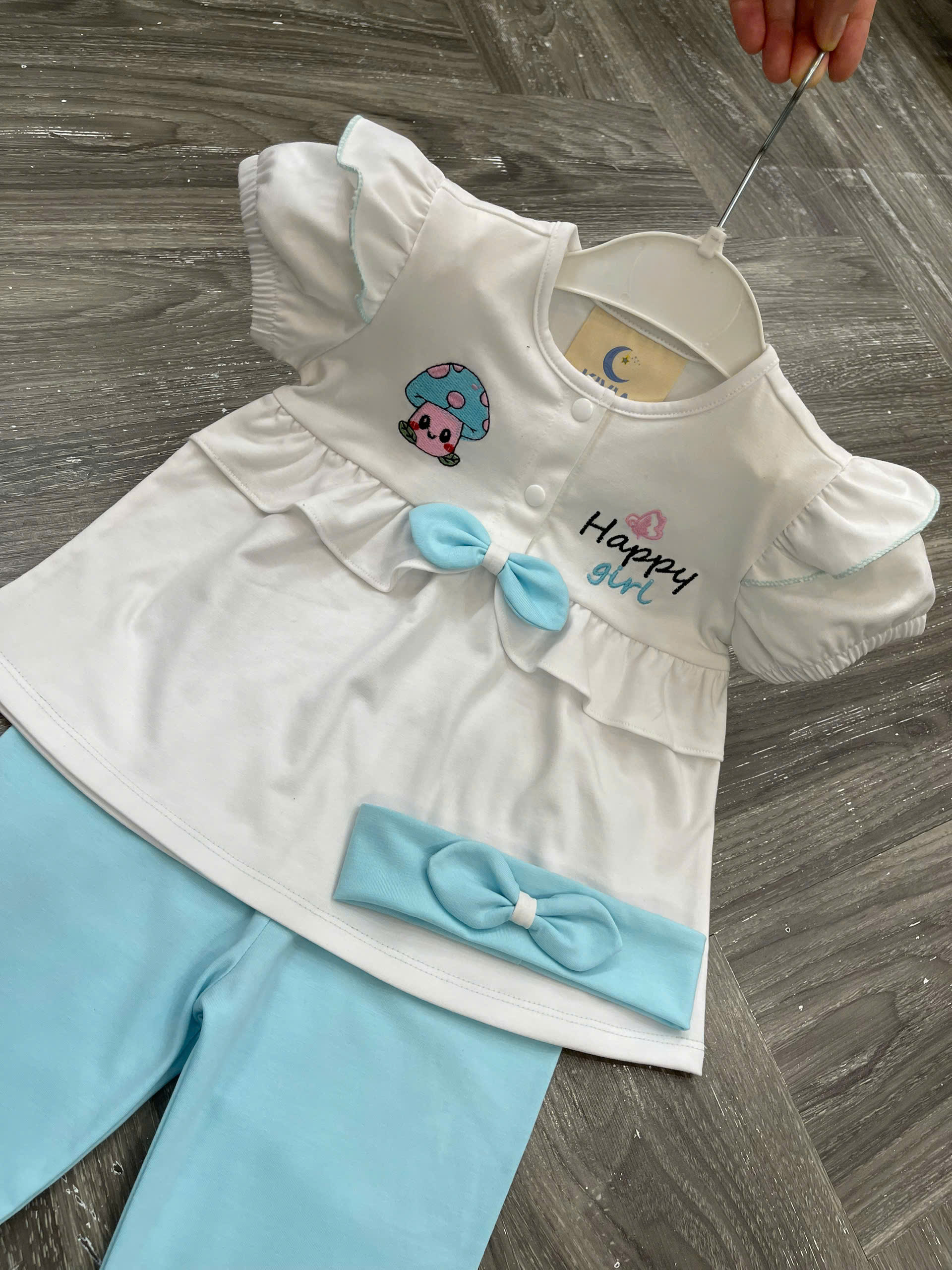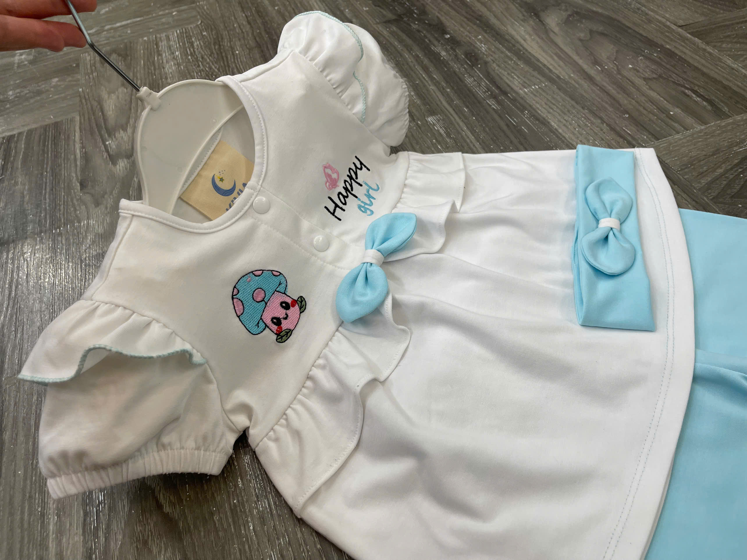 Họa tiết: Thêu hình nấm – chữ Happy Girl – nơ phối dễ thương