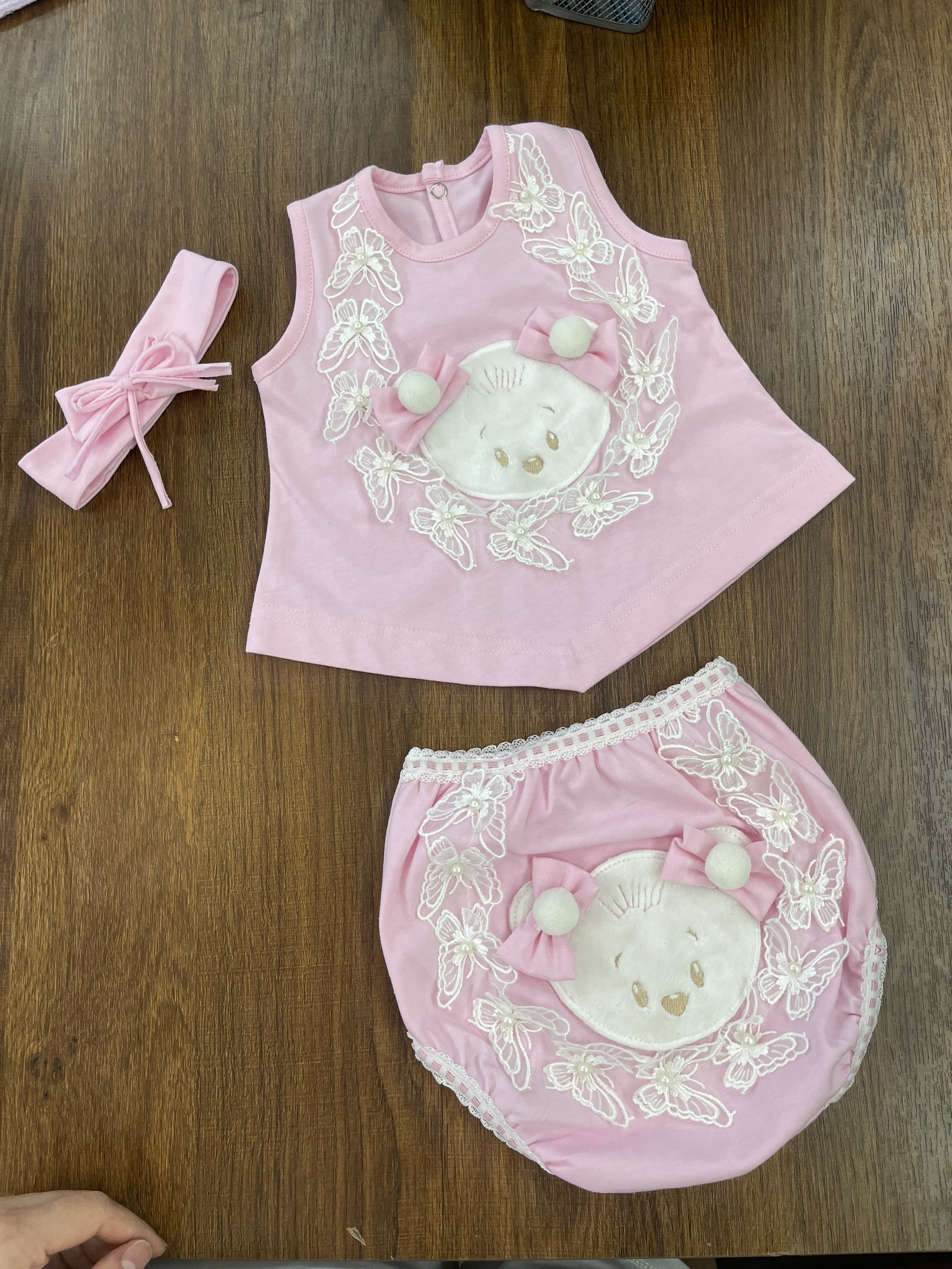 Design: Pink sleeveless top & matching bloomers, teddy bear face with 3D bow & pom-pom detail, lace butterfly embroidery, matching headband included