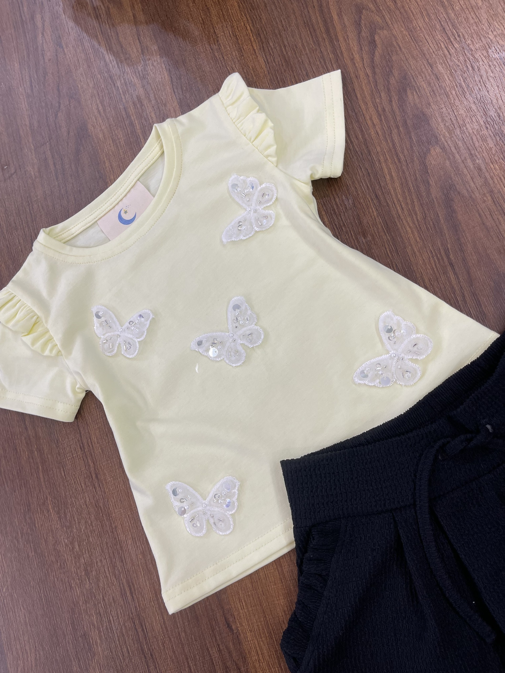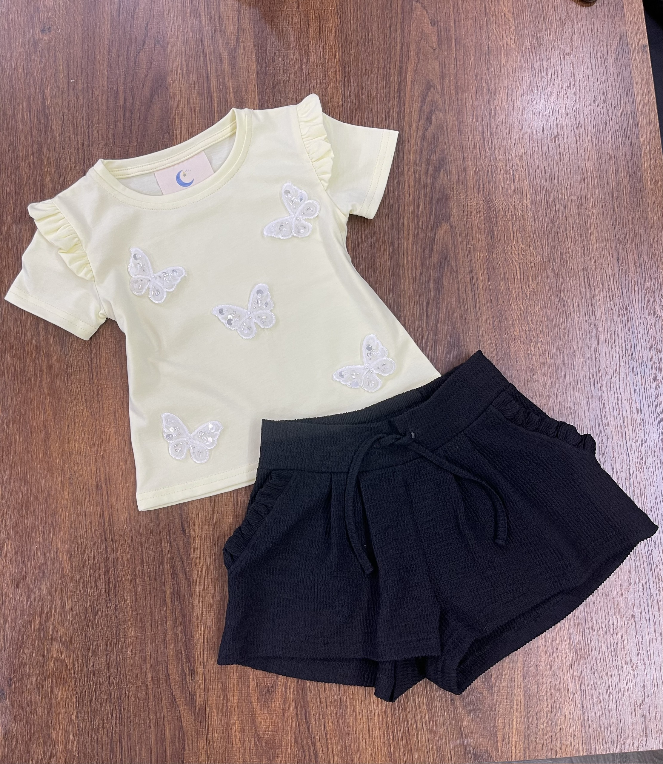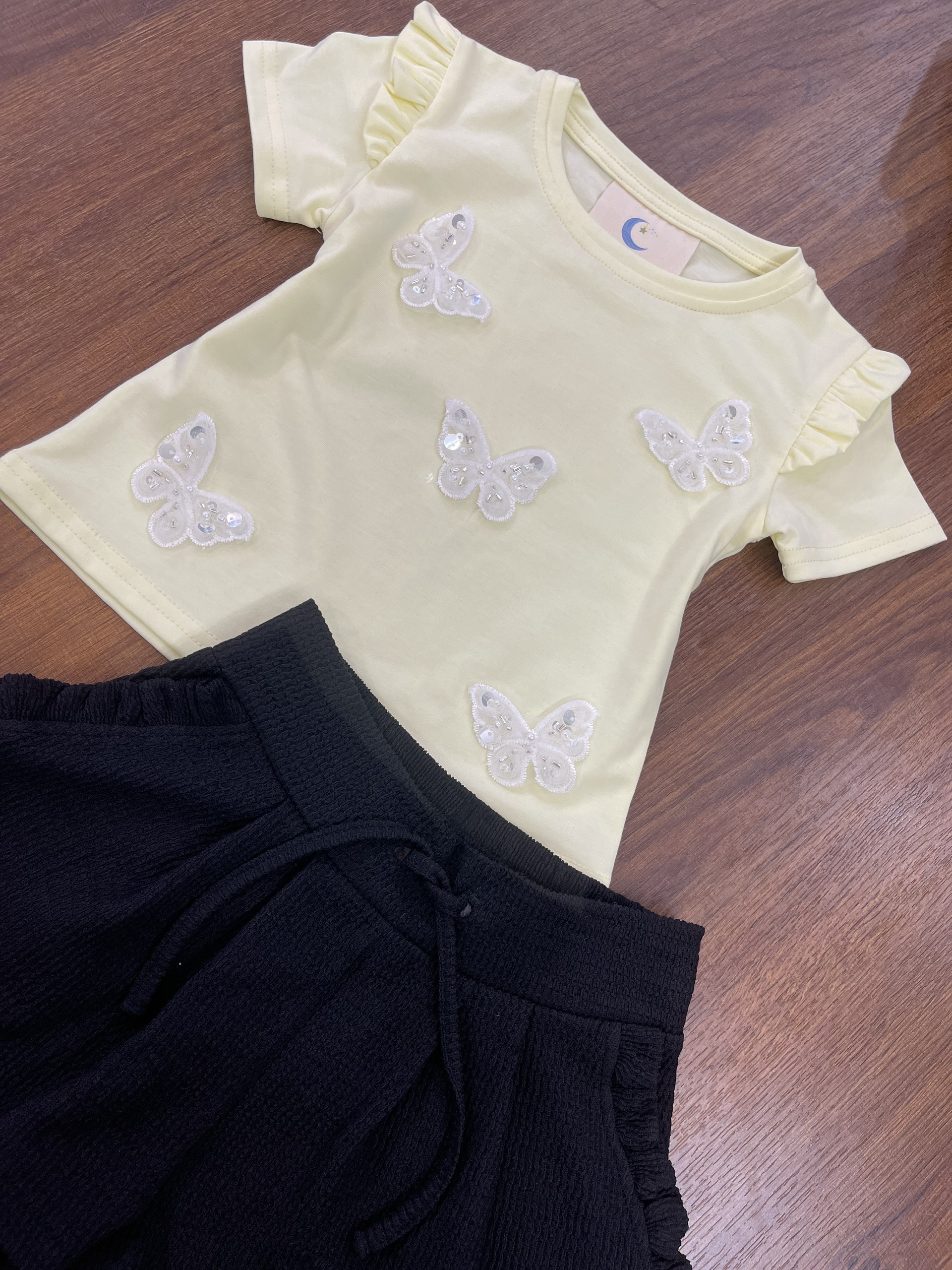 Design: Yellow short-sleeve top with ruffle shoulder detail, sequin butterfly embroidery, paired with black textured shorts featuring elastic waistband and tie detail