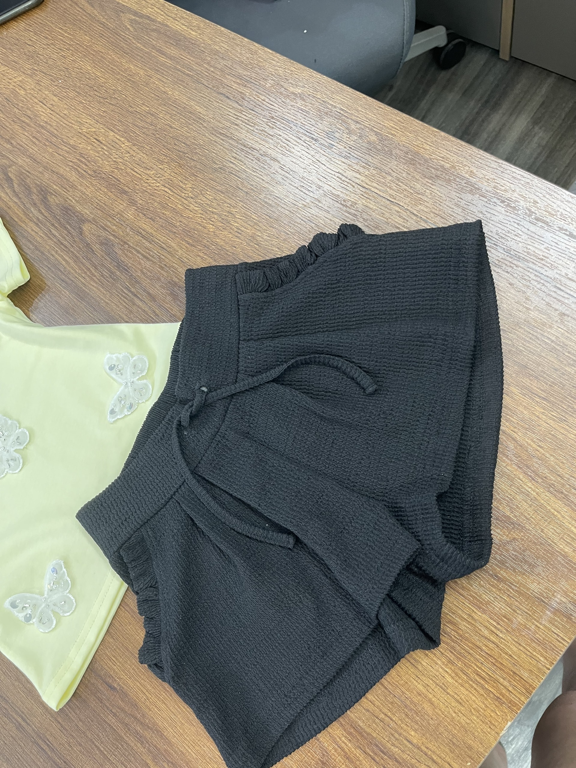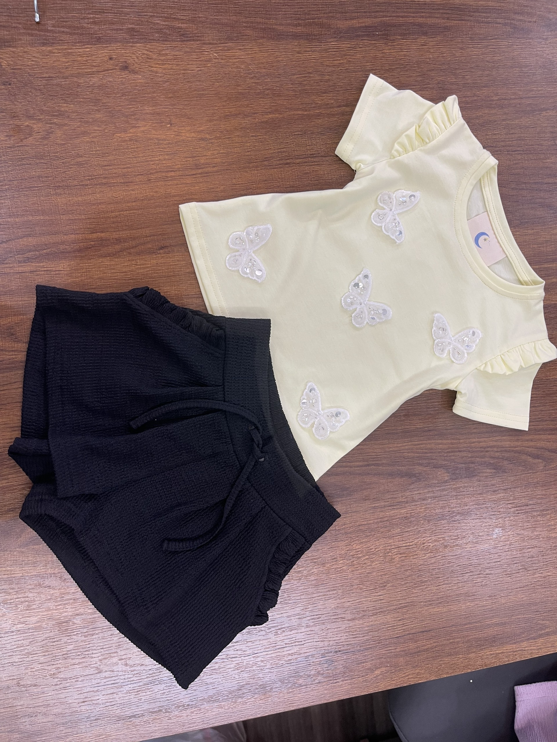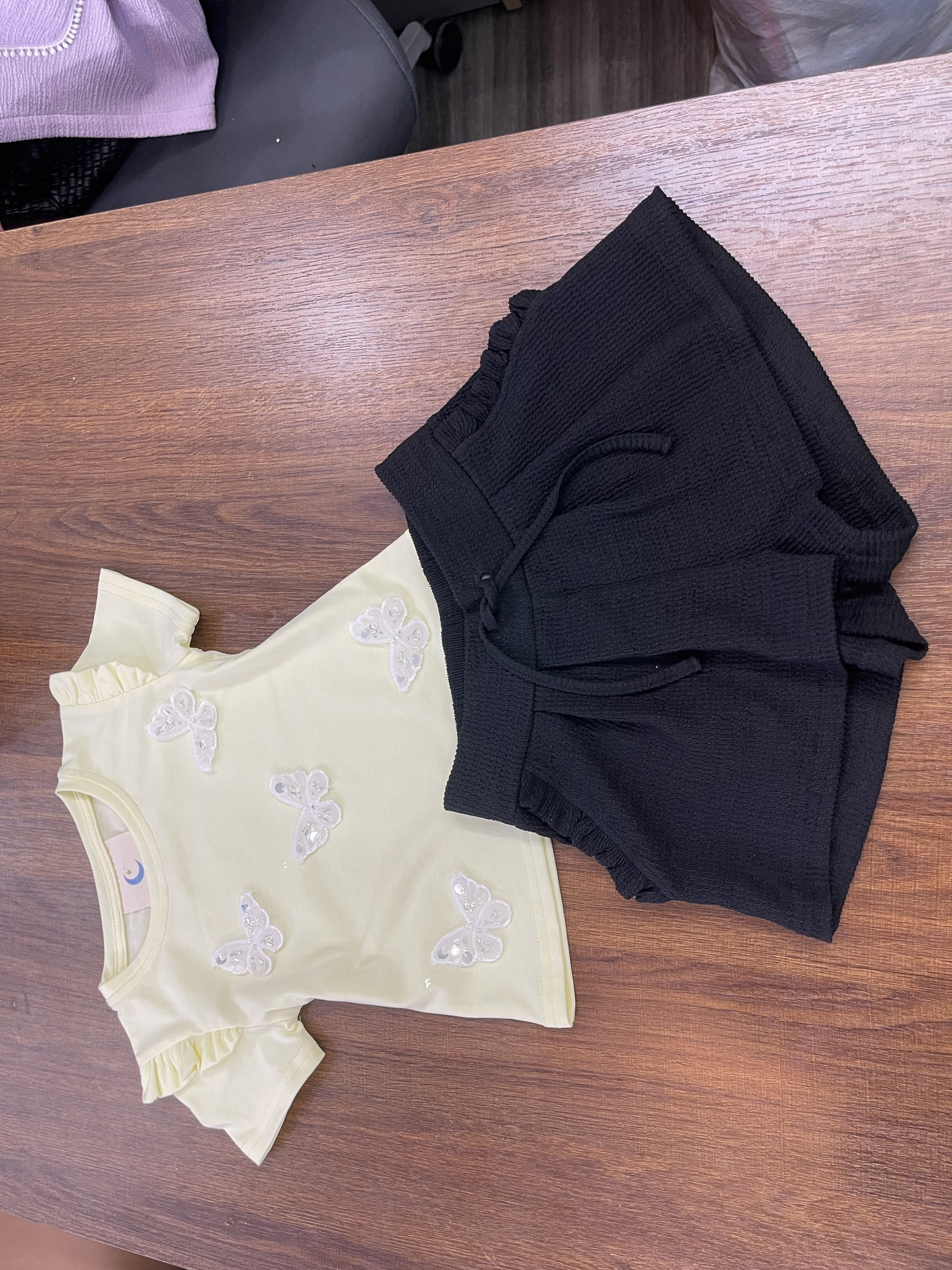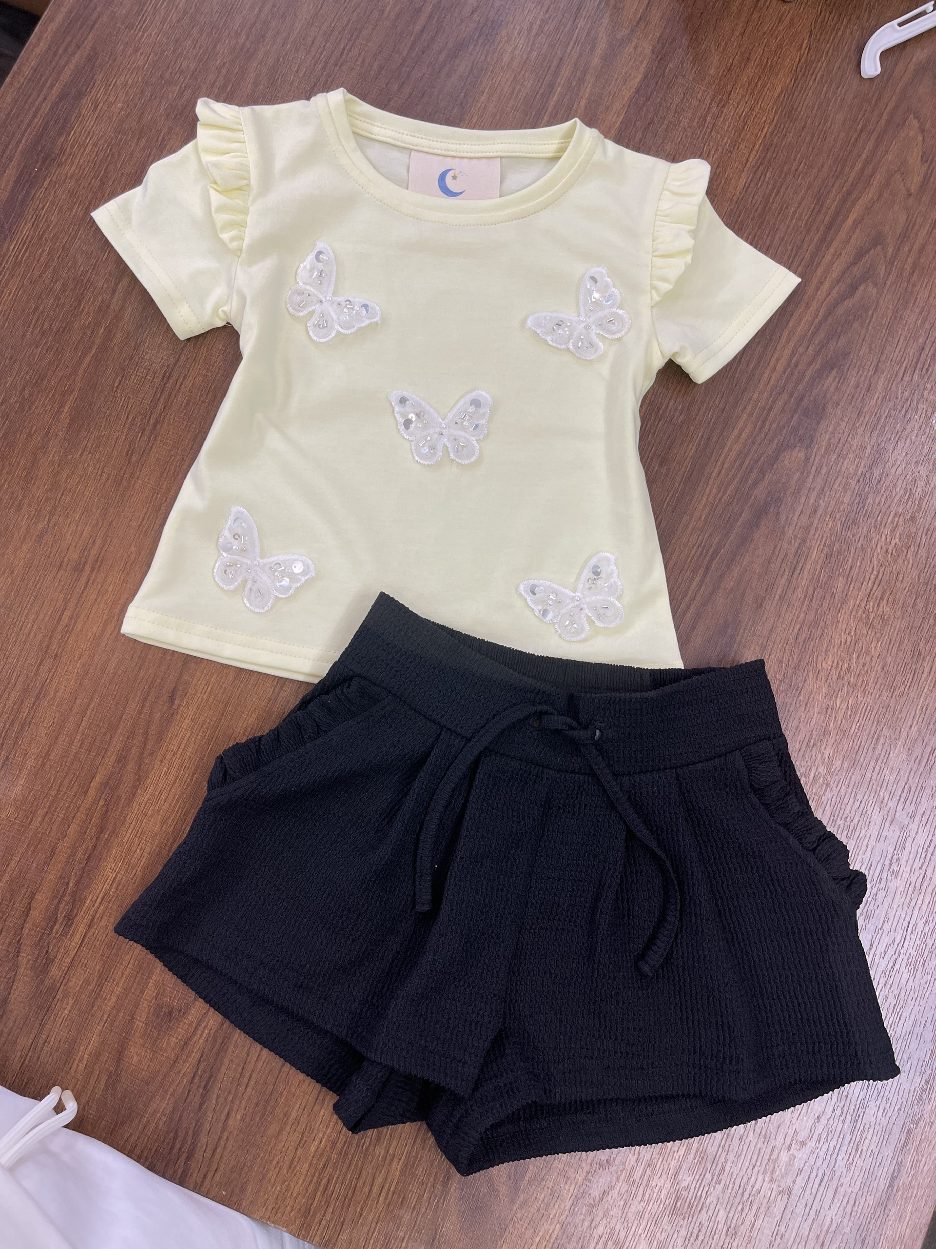 Design: Yellow short-sleeve top with ruffle shoulder detail, sequin butterfly embroidery, paired with black textured shorts featuring elastic waistband and tie detail