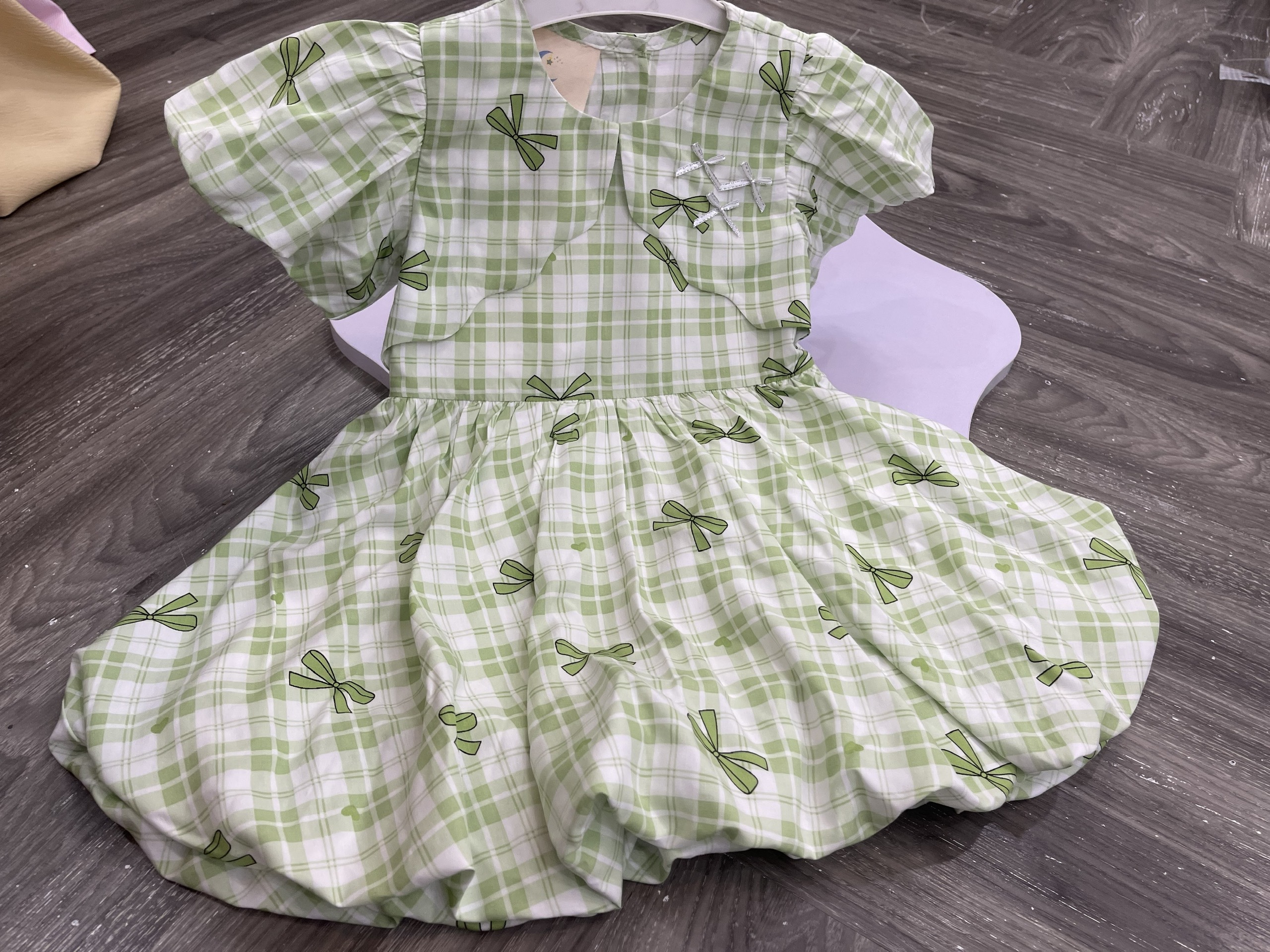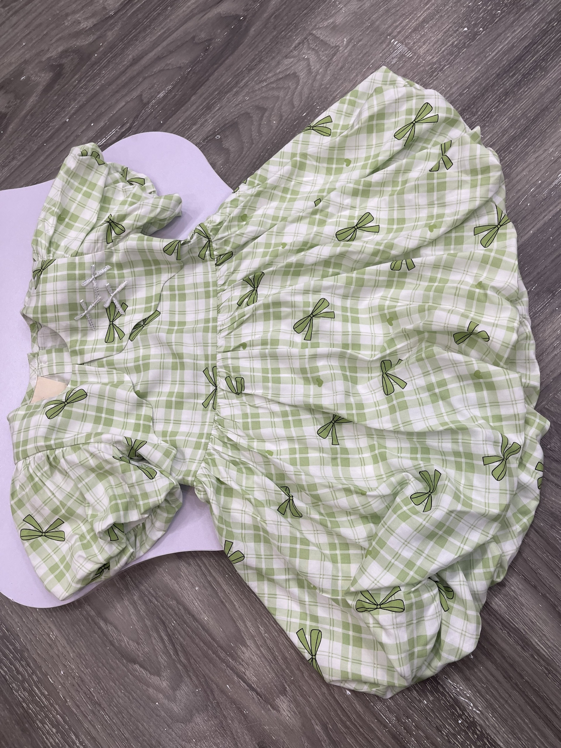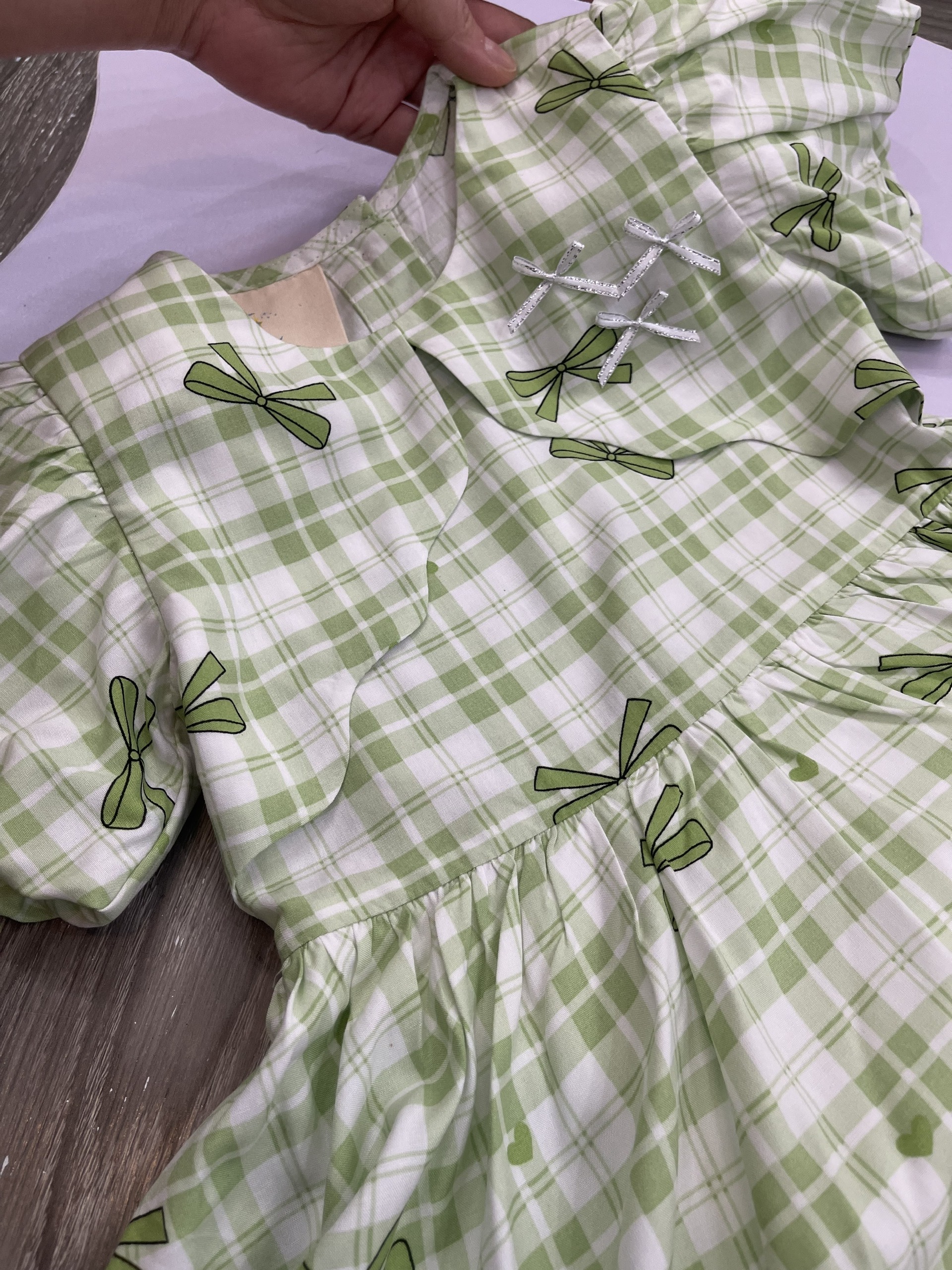 Họa tiết: Caro xanh lá phối nơ in toàn thân, điểm xuyến nơ đính ngực