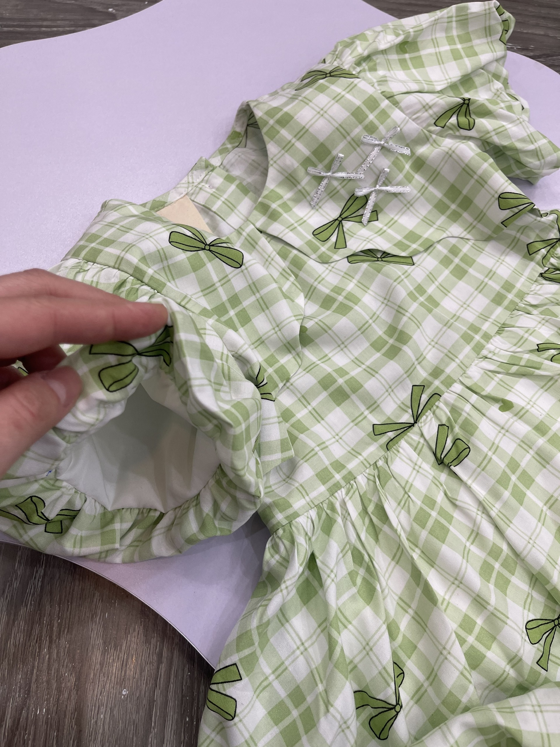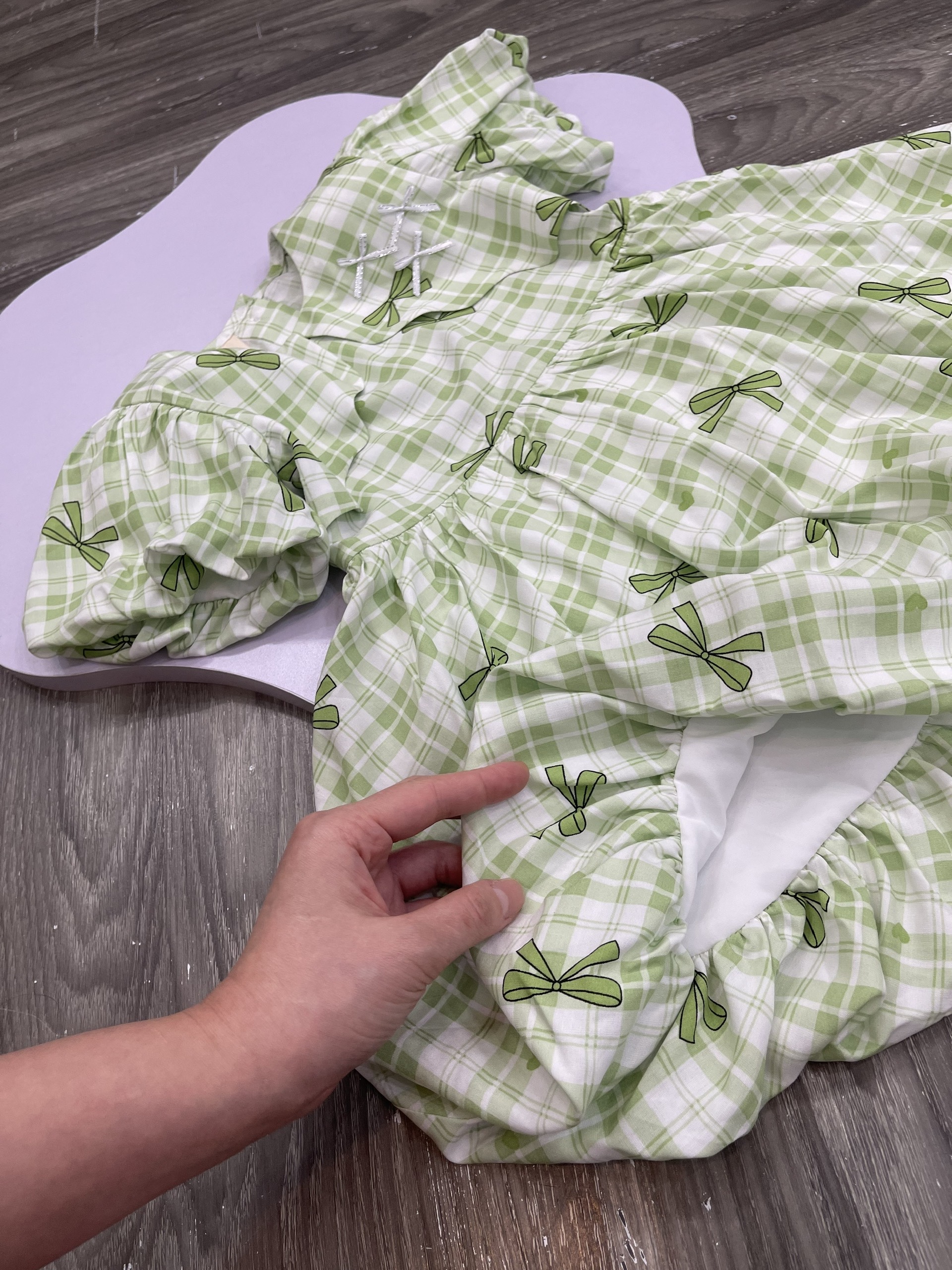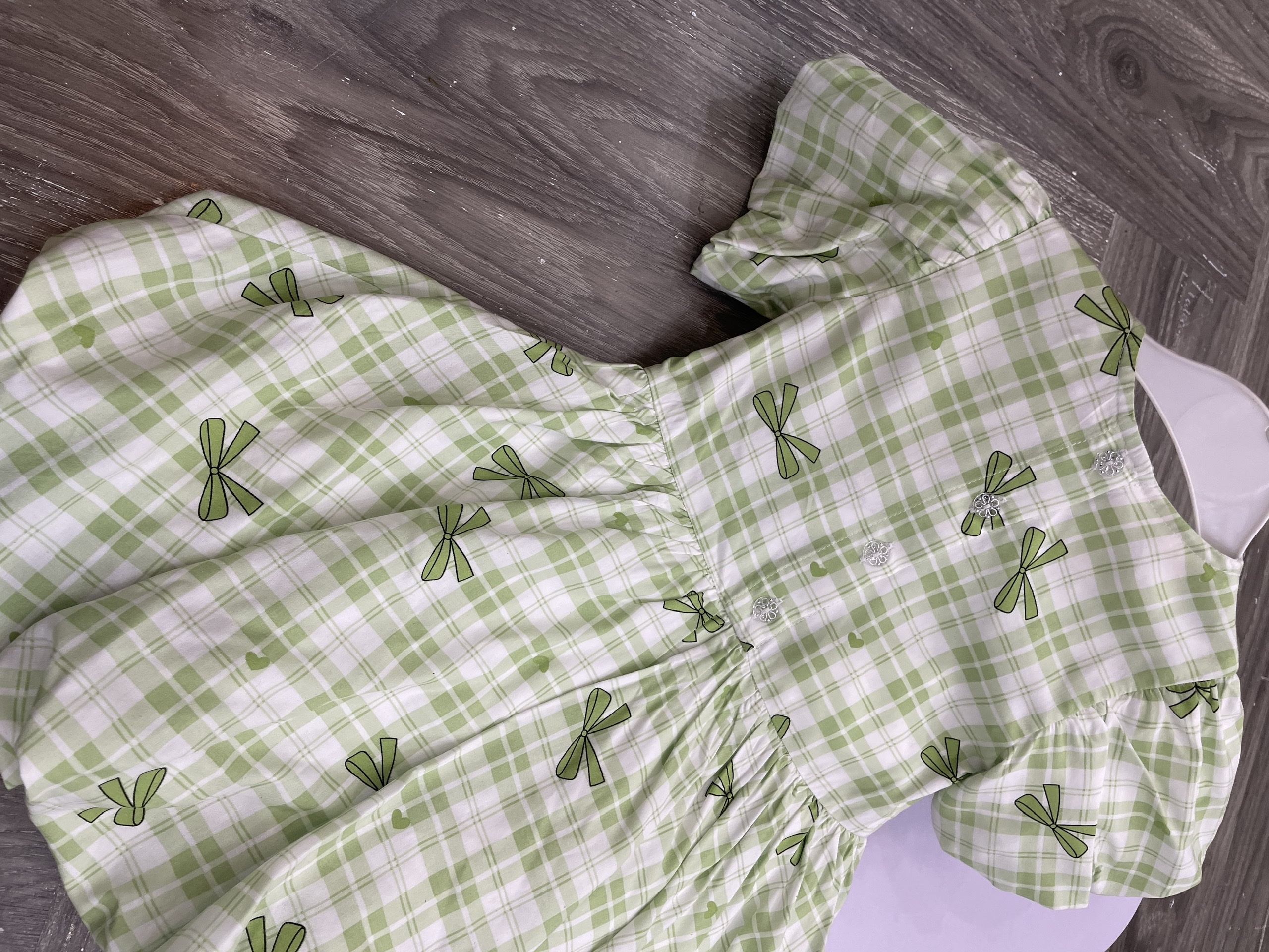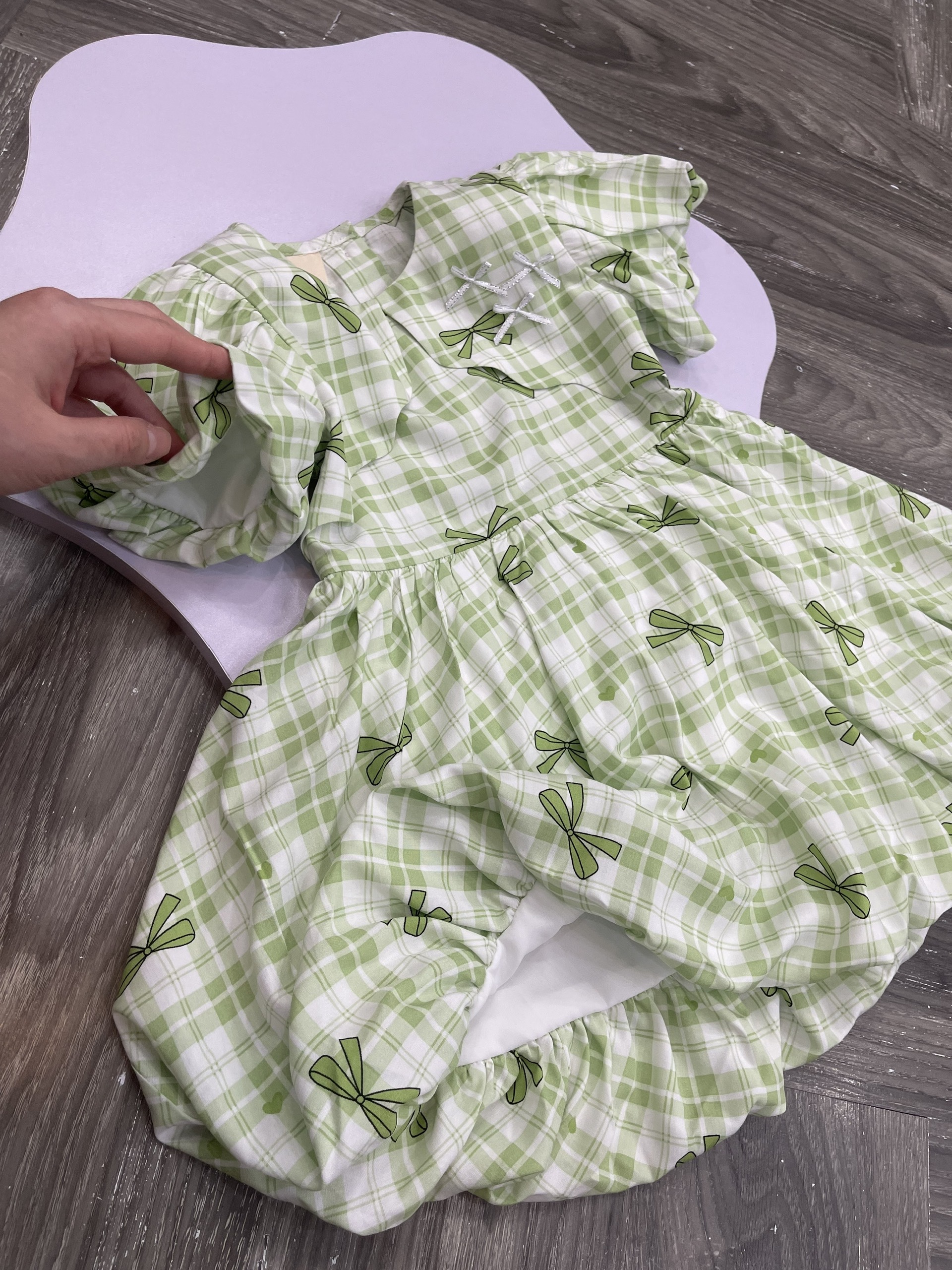 Họa tiết: Caro xanh lá phối nơ in toàn thân, điểm xuyến nơ đính ngực